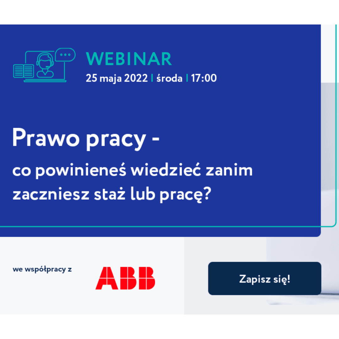 Już 25 maja (środa) zapraszamy na darmowy webinar “Prawo pracy – co powinieneś wiedzieć zanim zaczniesz staż lub pracę?”, organizowany wspólnie z ABB. Podczas spotkania ekspertki ABB odpowiedzą m.in. na pytania takie jak: